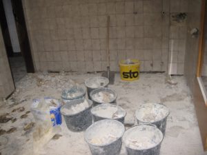 10. Juli 2025: Die Fa. Metzen und die Fa. Skirmontas entfernen den gesamten Estrich am Fußboden und alles, was nicht mehr zu verwenden ist.