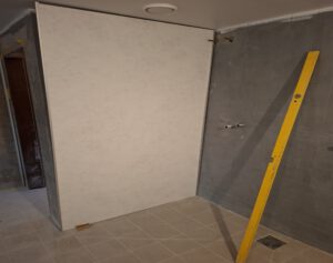 13. August 2025: Die erste Wandplatte in der Dusche ist angebracht