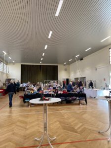 Sonntag, 23.11.2025 – langsam füllte sich die Halle mit den Ausstellern, die ihre Sachen hübsch drapieren. Der Kaffee war gekocht, der Waffelteig fertig und die Waffeleisen warteten auf ihren Einsatz, die Würstchen standen parat und der Glühwein war heiß gemacht. Ab 13 Uhr ging es dann los. Die Turnhalle füllte sich immer mehr mit Menschen, die die Sitzgelegenheiten zum netten Gespräch miteinander genutzt hatten.