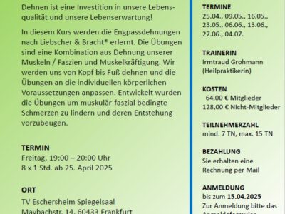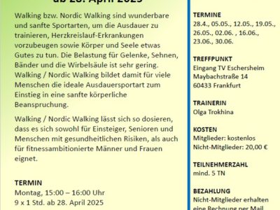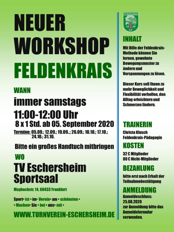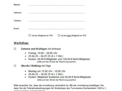Das sind abgeschlossene Kurse, die meist zwischen zwei Ferien stattfinden (von nach den Weihnachtsferien bis zu den Osterferien, von nach den Osterferien bis zu den Sommerferien..usw.). Teilnehmen können Mitglieder und auch Nichtmitglieder. Für die Workshops erheben wir einen kleinen Unkostenbeitrag. Wenn das Angebot gut angenommen wird, können die unterschiedlichen Kurse zu einem festen Bestandteil unseres Übungsplans werden.